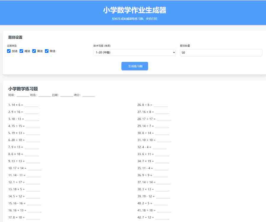 小学数学加减乘除作业布置出题网站源码简单方便的作业练习册随机出题网站源码支持打印,这款简洁实用的小学数学作业出题网站,该网站支持随机生成加减乘除题目,并可直接打印。界面采用了适合教育场景的柔和配色,操作简单直观,即使是家长也能轻松使用。