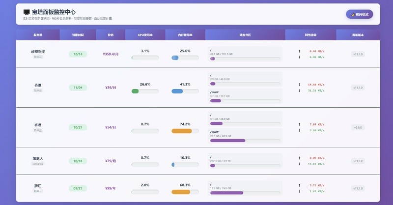 AI编写的一个服务器监控源码,接口使用的宝塔面板api,被监控机器需要安装宝塔面板,将压缩包上传至站点解压,修改“servers.php”内链接信息即可
